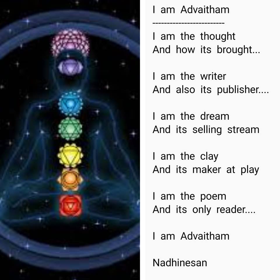 I am Advaitham…. April 13, 2019 0 Comments I am Advaitham ————————- I am the thought And how its brought… I am the writer And also its publisher…. I am the dream And its selling stream I am the clay And its maker at play I am the poem And its only reader…. I am Advaitham Nadhinesan Share Article: